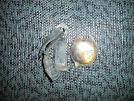 Xương ống chân và dây trói bằng chỉ cước xanh, sợi dây nịt bằng vải dù mặc dù cái đầu dây nịt đã rỉ sét